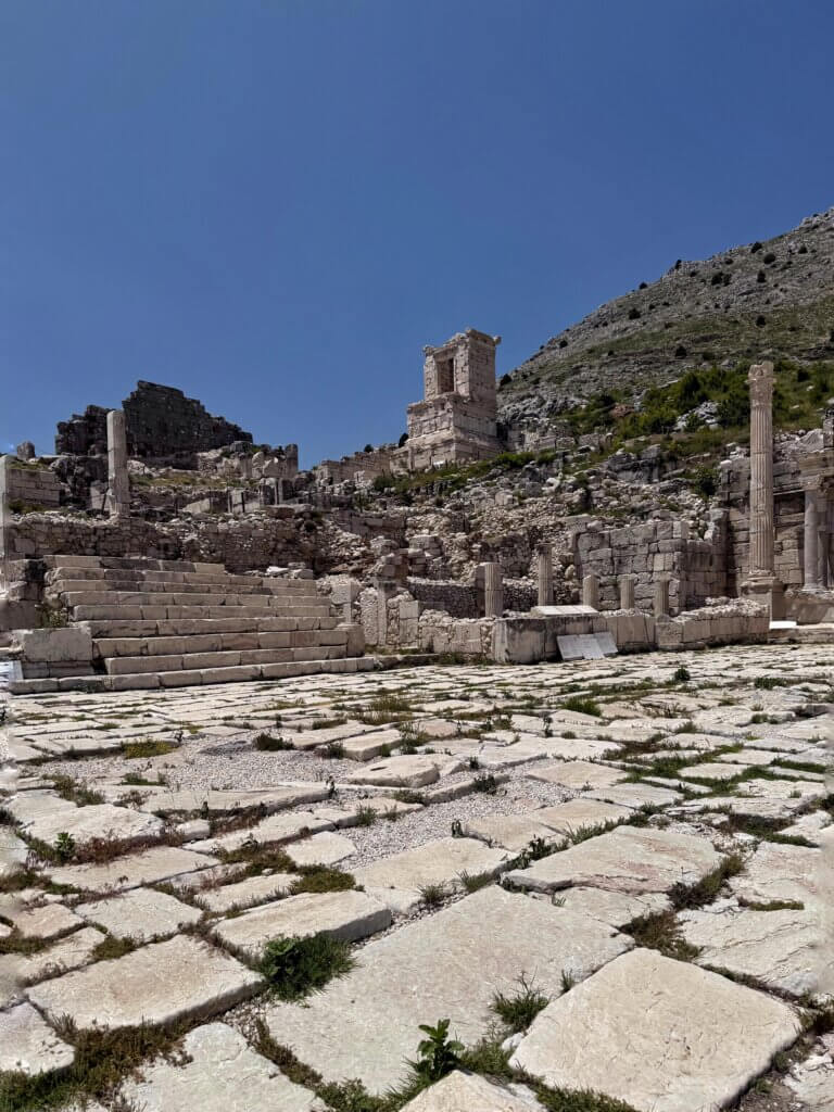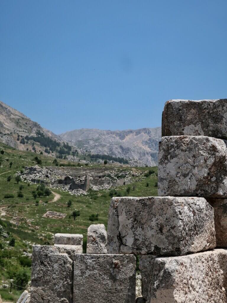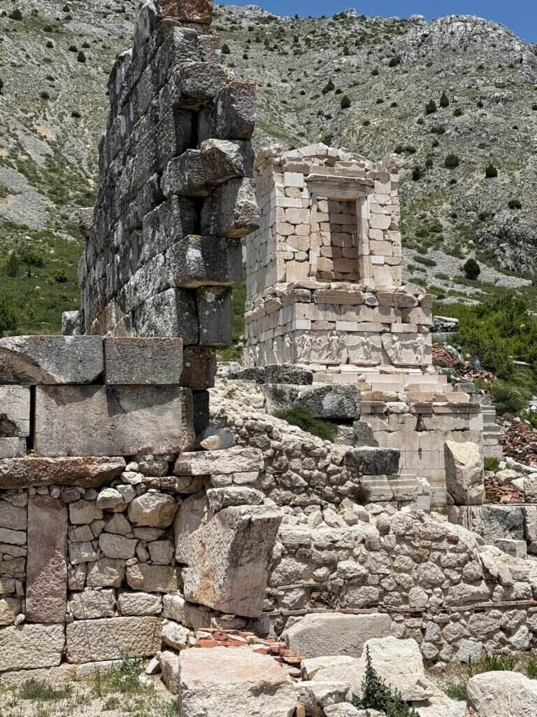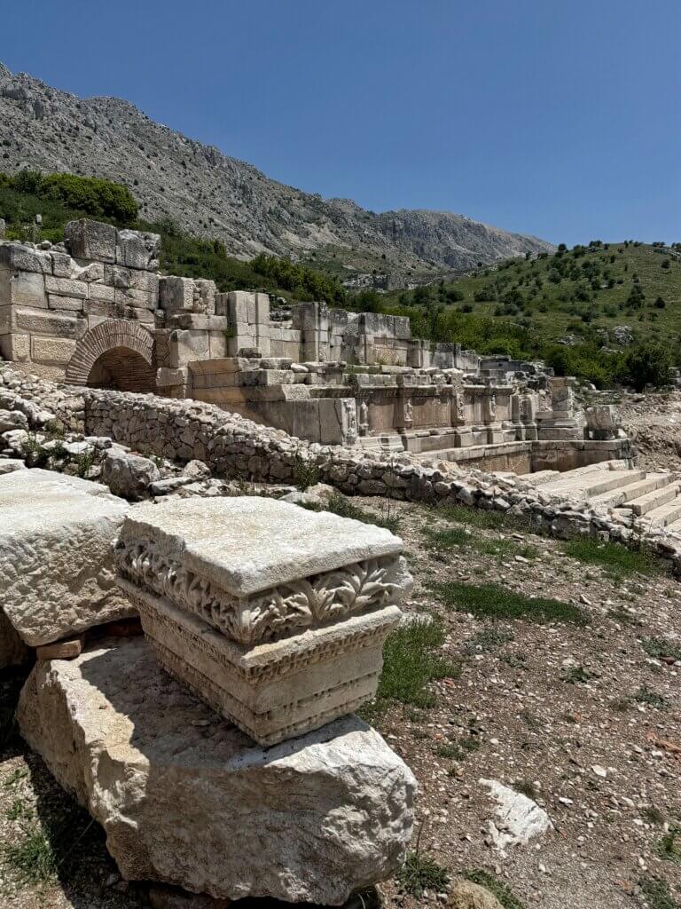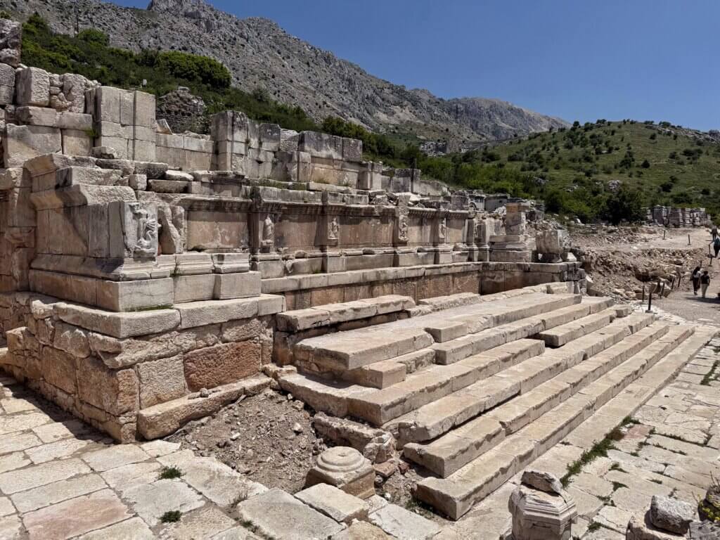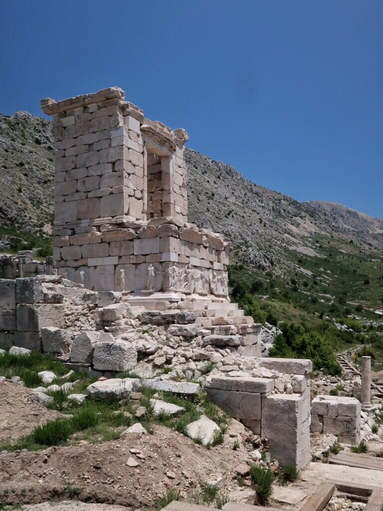 Von den Ruinen des Tempels neben dem Heroon hat man einen wunderbaren Blick bis zum Theater von Sagalassos, aber vor allem auf die Obere Agora mit dem Wahrzeichen Sagalassos, dem nahezu vollständig wieder errichtete Nymphäum aus der Zeit des römischen Kaisers Antoninus Pius.