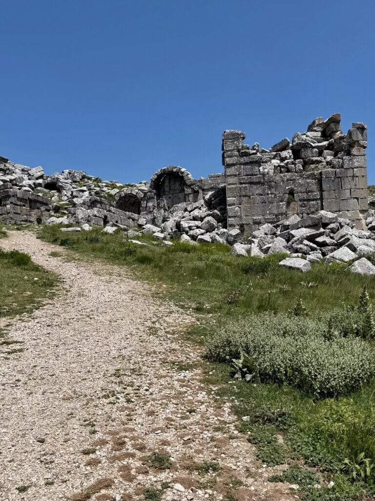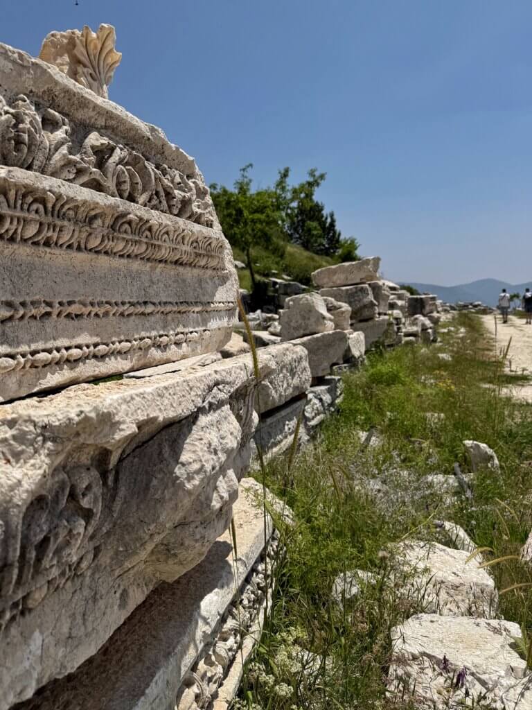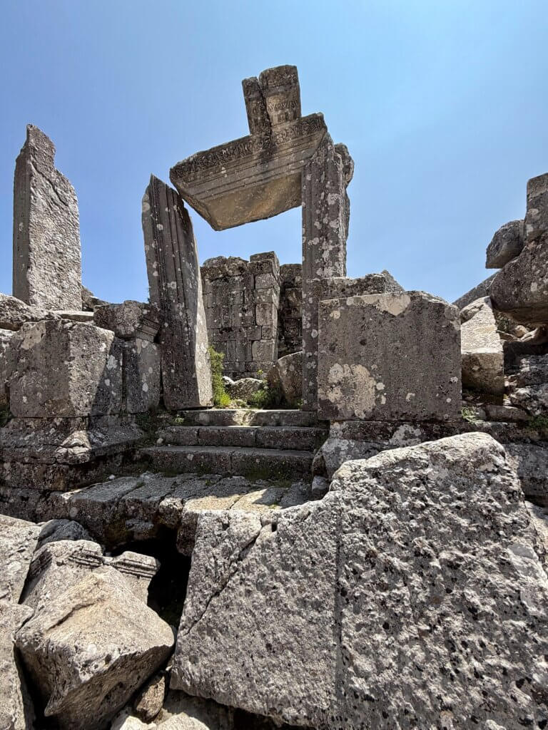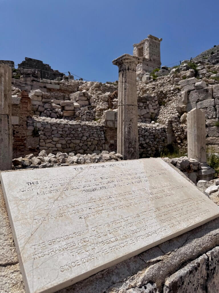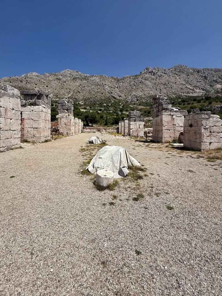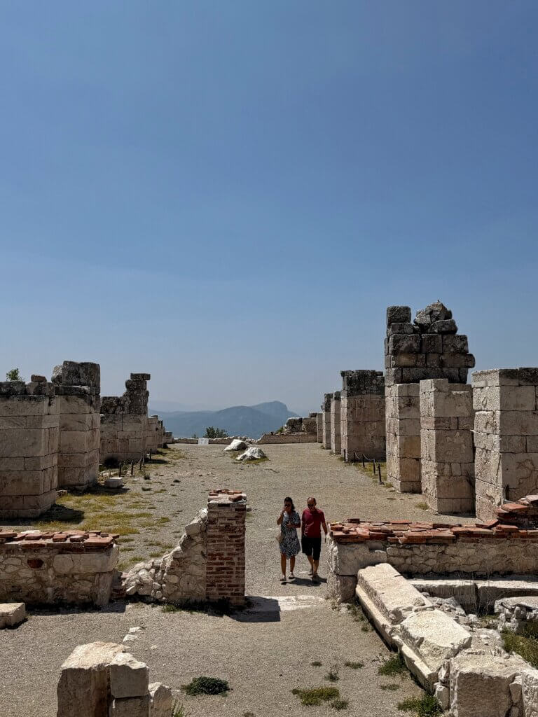 Von den Ruinen des Tempels neben dem Heroon hat man einen wunderbaren Blick bis zum Theater von Sagalassos, aber vor allem auf die Obere Agora mit dem Wahrzeichen Sagalassos, dem nahezu vollständig wieder errichtete Nymphäum aus der Zeit des römischen Kaisers Antoninus Pius.