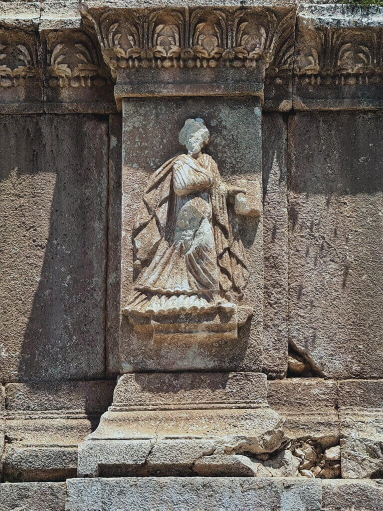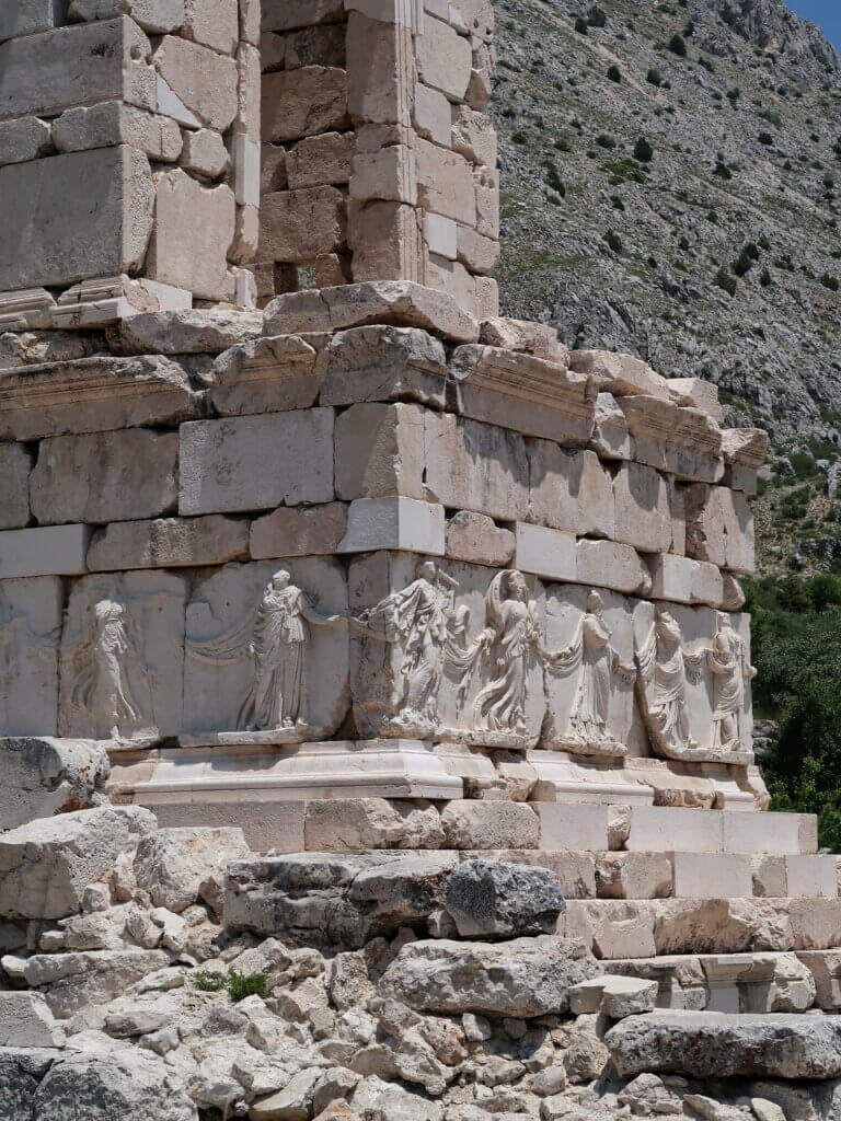 Für wen das fünfzehn Meter hohe Ehrenmonument zu Beginn des ersten Jahrhunderts errichtet wurde, ist nicht bekannt. Archäologen haben keine Widmungsinschrift gefunden. Vielleicht weil die Vorderseite des Gebäudes entfernt wurde, als es 400 Jahre später in die Wehrmauer der Stadt integriert wurde. Ein Relief-Fries mit einer Kette von vierzehn Tänzerinnen, die jeweils das Gewand der Nachbarin fassen, umgibt die Aussenfassade. Die Originalplatten wie auch die Überreste einer großen Statue aus dem Monument befinden sich im etwa vierzig Kilometer entfernten Burdur-Museum. Eine sehr große Sammlung von Statuen aus anderen antiken Stätten befindet sich im Antalya Museum.