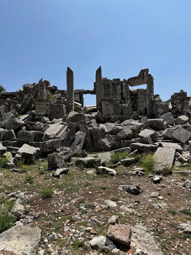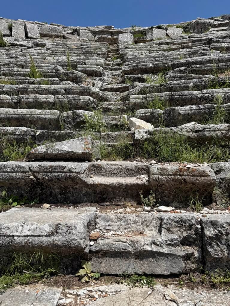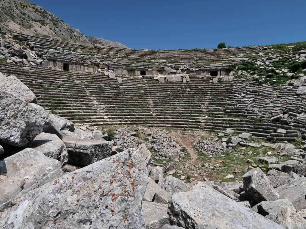 Mit der Aufführung von Schauspielen und Festen, Gladiatorenkämpfen und Tierhetzen war es spätestens nach dem Erdbeben im siebenten Jahrhundert vorbei. Die Südostseite des Theaters mit der Bühne liegt heute noch so zusammengestürzt dar wie seinerzeit. Die gegenüberliegende Seite mit den Zuschauerreihen überstand die Erschütterungen weitgehend unversehrt.