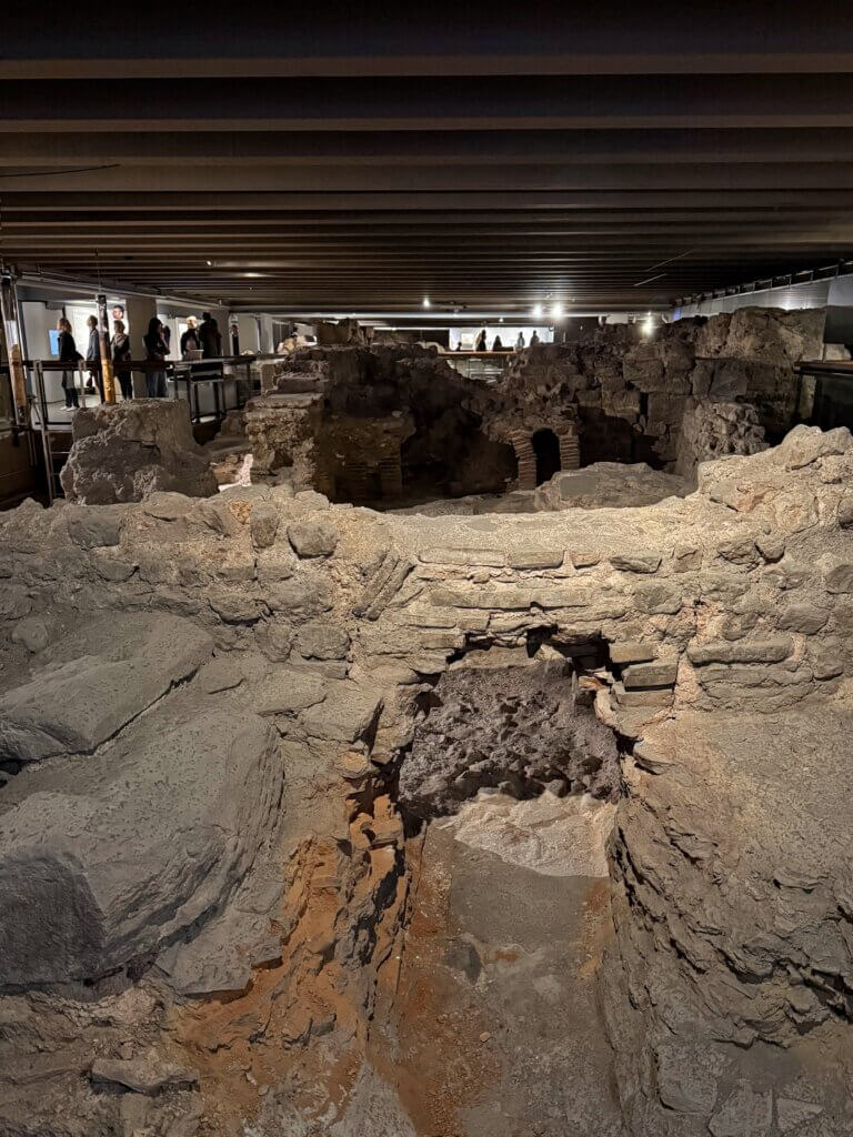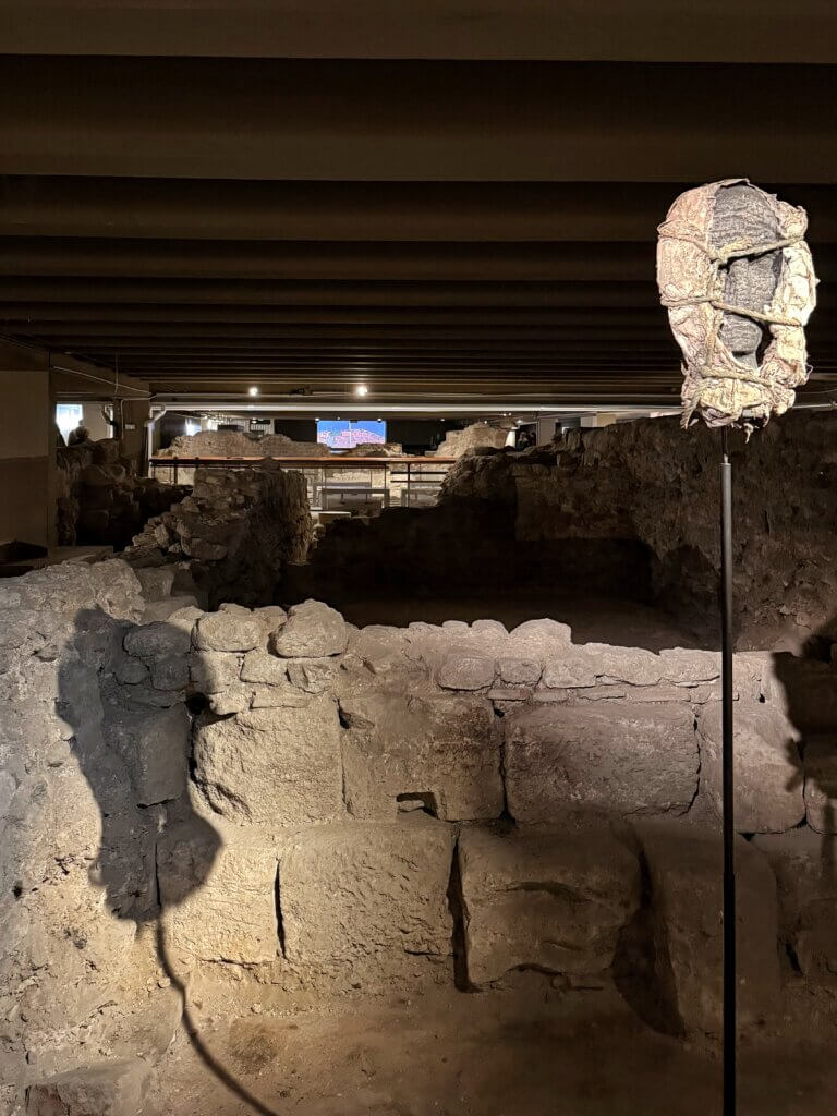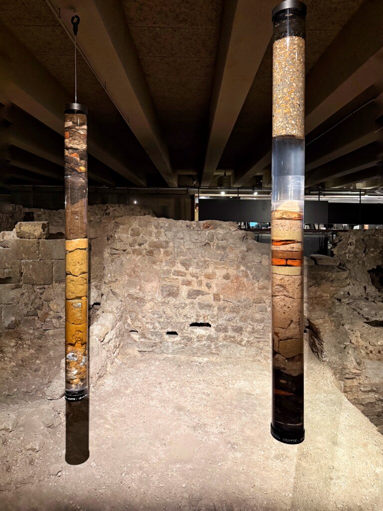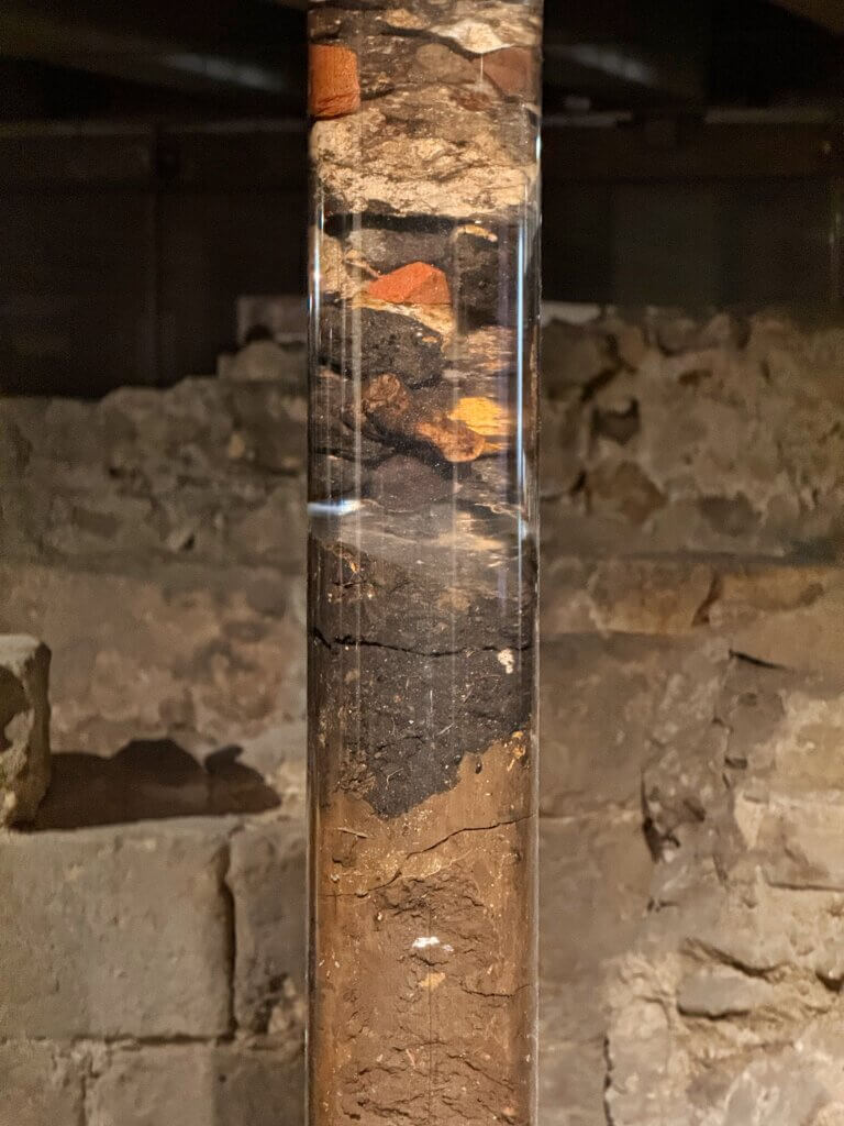 Interessant sind die ausgestellten Bohrkerne. Sie geben Aufschluss über die verschiedenen Erdschichten und Epochen. Angefangen von einer Teerschicht über eine dicke Betonschicht hin zur Darstellung des Hohlraumes, der durch die archäologischen Ausgrabungen entstanden ist und heute den Museumsbereich abbildet. Tatsächlich ist er im Bohrkern nicht maßstabsgetreu dargestellt. Darunter liegt eine graue Schicht Steinstaub, die beim Zerfall der Stadtmauern entstanden ist. Danach kommt ein großer Bereich aus der Spätantike, in dem sich Mauerreste, Mörtel, Kalkstein und Ziegelsteine befinden. Der unterste Bereich enthält Mutterboden mit Fauna, Knochen, Ziegel und insbesondere schwarze Keramik mit roter Masse aus dem ersten Jahrhundert.