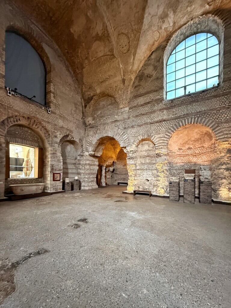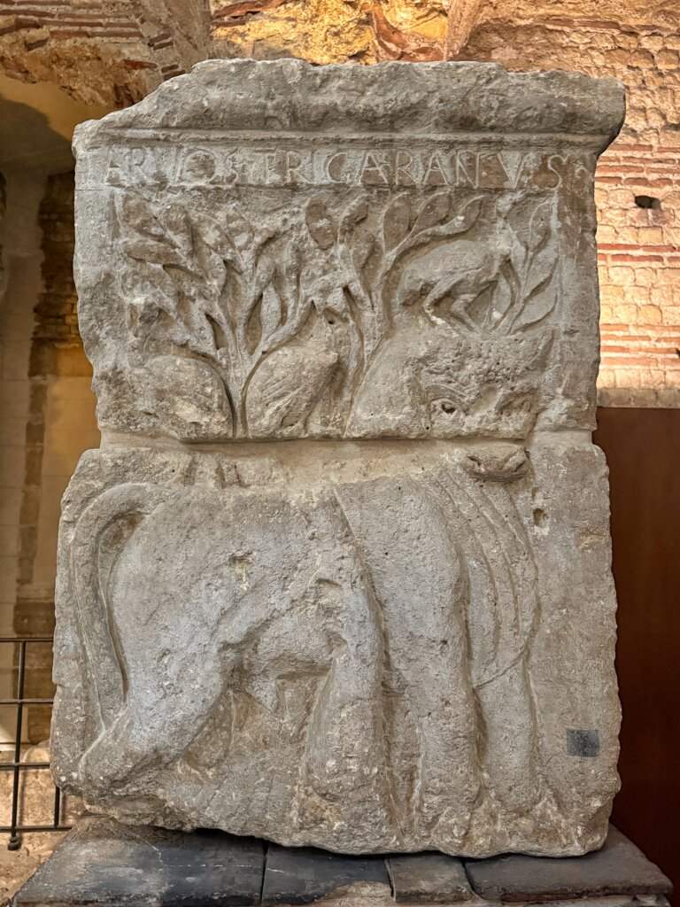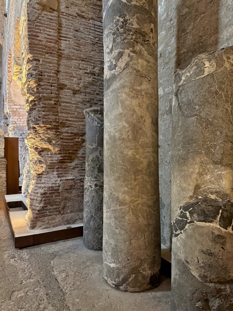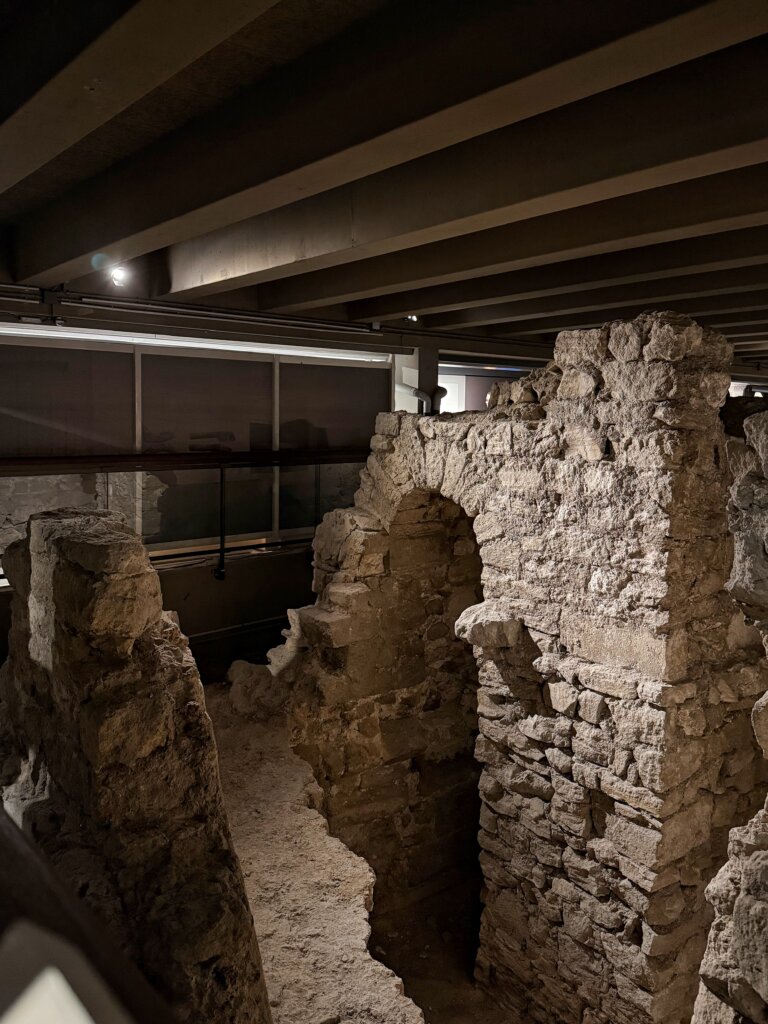 Interessant sind die ausgestellten Bohrkerne. Sie geben Aufschluss über die verschiedenen Erdschichten und Epochen. Angefangen von einer Teerschicht über eine dicke Betonschicht hin zur Darstellung des Hohlraumes, der durch die archäologischen Ausgrabungen entstanden ist und heute den Museumsbereich abbildet. Tatsächlich ist er im Bohrkern nicht maßstabsgetreu dargestellt. Darunter liegt eine graue Schicht Steinstaub, die beim Zerfall der Stadtmauern entstanden ist. Danach kommt ein großer Bereich aus der Spätantike, in dem sich Mauerreste, Mörtel, Kalkstein und Ziegelsteine befinden. Der unterste Bereich enthält Mutterboden mit Fauna, Knochen, Ziegel und insbesondere schwarze Keramik mit roter Masse aus dem ersten Jahrhundert.