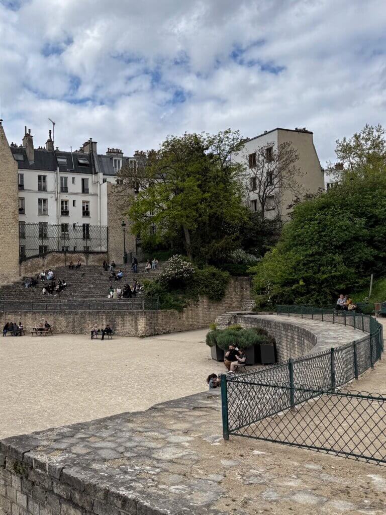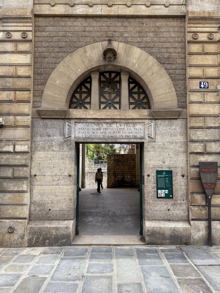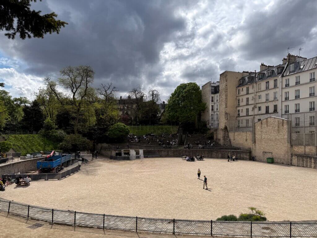 Die letzte Station des römischen Erbes von Paris ist das Amphitheater, die Arènes de Lutèce. Unscheinbar öffnet sich der Eingang zur Arena an der Rue Monge 49 zwischen einem Restaurant und einem Hotel. Die Stätte wurde im ersten Jahrhundert erbaut und bot Platz für etwa 15.000 bis 17.000 Zuschauer, was fast der gesamten damalige Bevölkerung Lutetias entsprach.